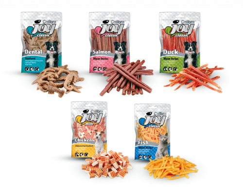 There are many reason why your dog or cat deserves a tasty treat - for performing an entertaining trick, for learning a new command, or simply for being there. Show them you love them with Calibra Joy's tasty healthy treats. The line includes soft and delicious meaty treats in the form of larger strips, sticks, and small cubes. For dogs, we also have functional dental treats that help maintain healthy teeth and fresh breath.