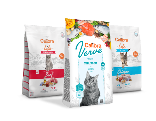 Calibra Cat Verve Sterilised Herring is a complete grain-free food with a high content of fresh fish. The recipe is designed for spayed and neutered cats. Fresh mackerel and salmon make up 29 % of the overall content. Animal source proteins make up 75.4 % of the recipe's total protein content.